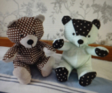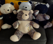 We lovingly hand make teddy bears from material you provide, or from our own stock of material. You can send us items of clothing such as a blanket, t-shirt, a shirt or football shirt and we will create a one of a kind, hand made teddy bear. The bears can be single or multiple colours depending on the items you wish to send.